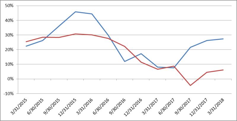笔者对安德玛心存疑虑的另一原因与公司的过量库存和最近增加的促销活动有关。安德玛最近的库存增速值得警戒,从下图可见,公司库存增速已经连续三个季度远超营收增速,并且二者之间的差距还在不断扩大。
