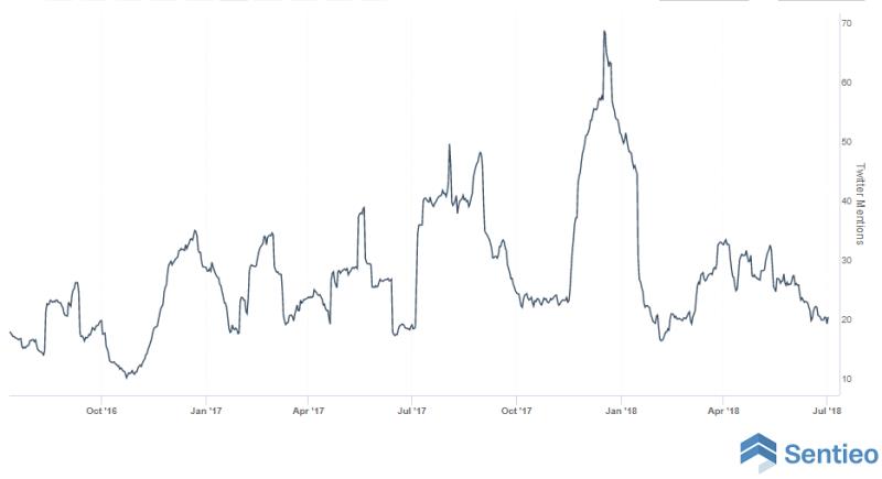 尽管安德玛过去几个季度大力开展促销活动,但库存仍然持续增长,在去年第四季度达到顶峰,安德玛的库存之多远超其它同行。笔者曾通过推特展示安德玛促销活动的增长情况。通过监测提及促销相关关键词的数量,就能跟踪某一品牌促销活动随时间的变化情况。下表显示了30日内提及安德玛促销活动关键词的数量走势。尽管安德玛上个月的促销活动力度有所减轻,但仍然与2016年至2017年间和2017年同期的促销力度几乎一致,这表明公司的促销活动并未取得实质性进展。