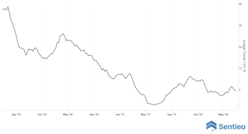 尽管安德玛目前营收和利润增速不佳,但市场给予它的估值甚至远超行业巨头阿迪。安德玛库存过剩,公司大力进行促销活动导致毛利润还将继续承压,影响未来业绩改善。此外,安德玛缺乏品牌吸引力,谷歌搜索数据显示消费者对其关注度在不断下滑。