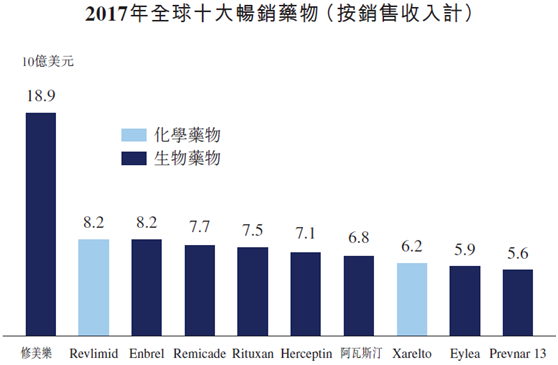 生物药物受益于遗传学、分子生物学和生物化学方面取得的突破性进展,对疾病治疗带来了变革,是目前世界上最畅销的医药产品。2017年十大畅销药物中,八种为生物药物,总销售收入为678亿美元,占十大畅销药物总销售收入的82.5%。