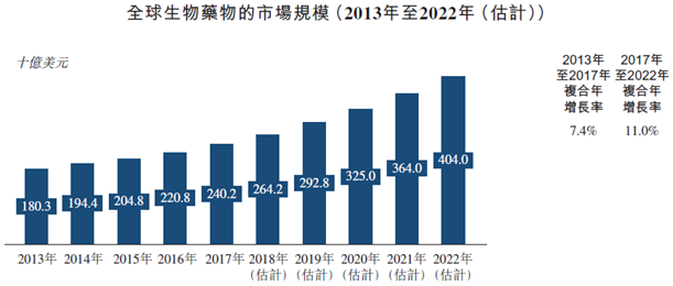 由于生物药物需要整合多个学科的知识和专业技能,开发、制造和推广充满挑战、非常复杂,并且需要巨额资本投入,行业准入门槛相对较高。预计2017年至2022年全球生物药物市场规模年复合增长率将达到11%,于2022年达到4040亿美元。