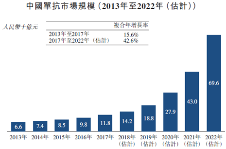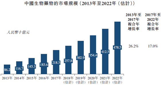 由于受癌症患者的需求缺口、医疗费用增加、有利的政策、新生物医药的批准及研发费用的推动,中国生物制药市场快速增长,速度超越全球其他市场。预计2017-2022年年复合增长率将达到17%,于2022年销售收入达到4785亿元。