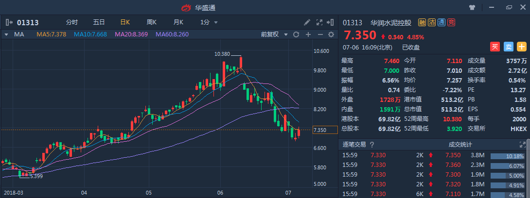 中国政府致力于优化投资结构,以稳定经济增长为重。年内全国基础设施投资高达14万亿元人民币,比上增加19%。同时房地产销售面积亦比上增加7.7%至16.9亿平方米。全国水泥企业也靠整合重组,以提升行业之集中度,改善竞争环境。而新增产能亦未见大幅增加,以保障价格稳定向上。可于现价7.35元附近买入,中长线可见9.70元,跌穿6.10元止蚀。