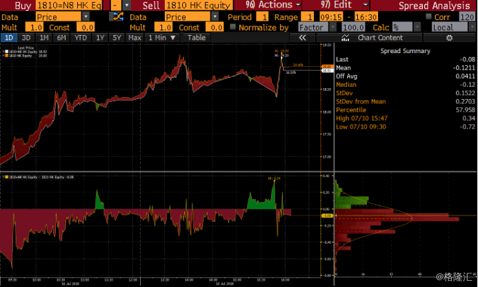 由于7月9日是小米上市首日,没有历史折价率可供参考,我们从开盘观察到11点,能发现折价率维持在4%~5% 之间,那么11:30折价率瞬间打到7%,就是一个买入小米期货的多头信号,我们以11:31分的15.8元买入小米期货,持有到下午1:45,折价率缩小到2%,以13:47的16.48元卖出小米期货,那么1手交易,在手续费前获利 (16.48-15.8)*1000=680元,手续费来回2.2元,费后获利677.8元。如果觉得当时折价缩小太多,平多同时,反向开空,以16.48元开仓卖出小米期货,折价率一直到收盘都没有再次扩大,我们在收盘前15:55之后,平掉空头头寸,15:56交易价格为16.28,那么开空这笔交易,手续费前获利 (16.48-16.28)*1000=200元,扣去手续费2.2元,获利197.8元,当天收益率(677.8+197.8)/5280=16.6%。