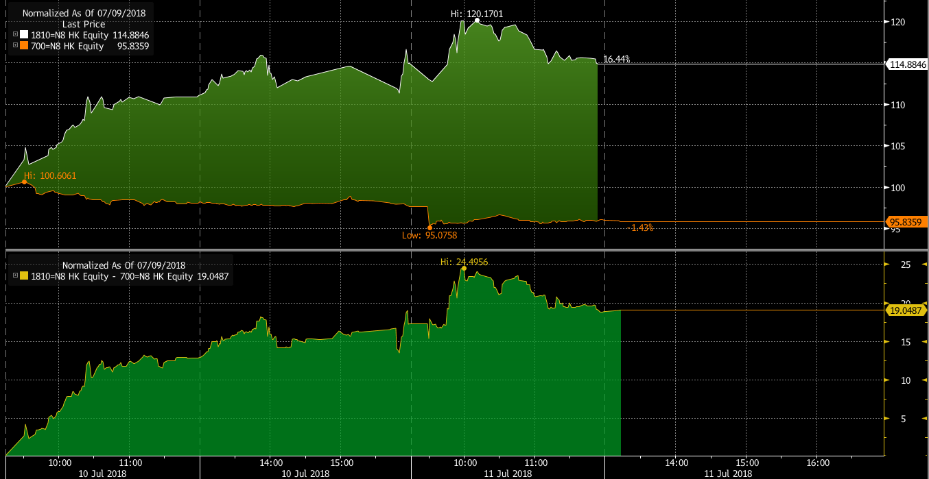 小米集团(01810.HK)于千呼万唤之中于7月9日在香港交易所上市。香港交易所亦把小米集团的期货及期权(代号: MIU)同步上市。于上市前,小米股份表现获外界一致看淡,开市初段其股价表现的确未如理想,可是翌日(7月10日)甫开市已重上招股价,其后股价节节向上。相反同属科技股板块的腾讯控股(00700.HK)却表现一般,投资者或可考虑以小米及腾讯做多空配对交易。