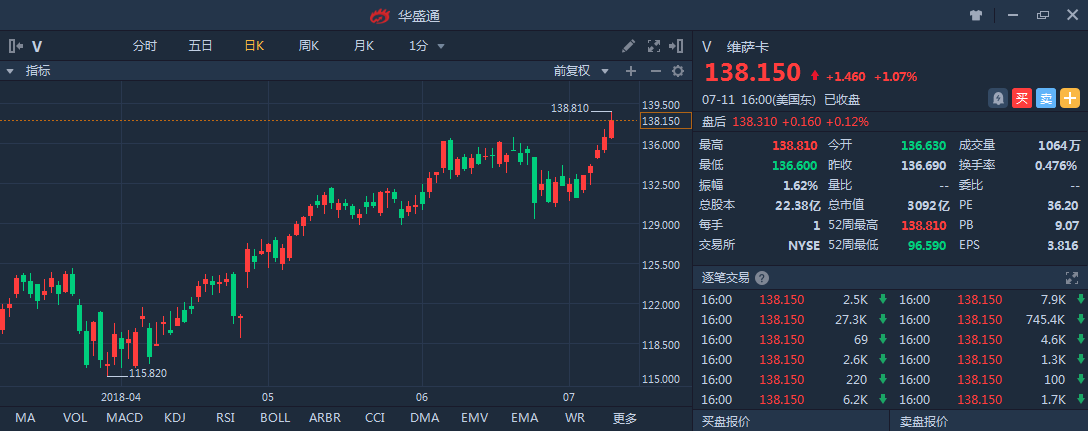 美东时间7月11日,支付巨头Visa(V)涨1.07%报收138.15美元,盘中触及历史新高,且4月以来股价上涨15.7%。得益于非现金支付和消费人口的持续增长,公司业绩不断提升,以下是具体分析: