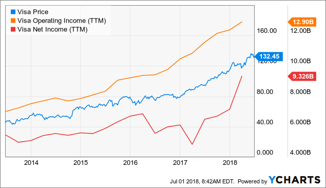 支付技术服务属于高利润行业,公司15年至今的毛利率一直维持在75%以上。在15-17财年,公司的净利润分别是63.28亿、59.91亿和66.99亿美元,18年过去12个月(TTM)的净利润大幅提升至93.26亿美元。公司营业利润的快速增长趋势更加明显,15-17财年营业利润分别为124.89亿、133.93亿和163.14亿美元,18年TTM为174.04亿美元。净利润和营业利润的表现推升股价一路走高,见下图: