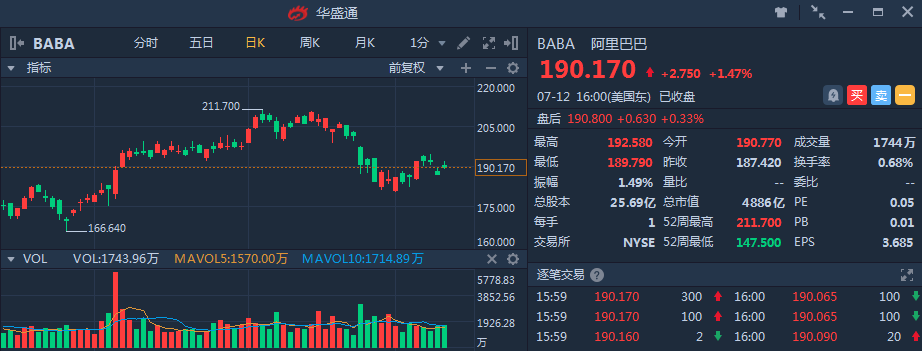 受中美贸易战影响,中国股市持续低迷,受此拖累,阿里巴巴的股价从最高的211.7美元回撤,7月12日收盘价为190.17美元。