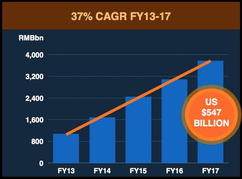 从基本面来看,阿里巴巴的规模扩张可以持续。中国的零售市场非常巨大,而且随着中产阶级的增加,零售市场规模也在不断扩张。数据显示,国内零售市场规模自2013财年以来保持复合年均增长37%的增速,等到2018财年,市场规模将达到7810亿美元,同2017财年相比增长43%。在2020财年,将超过1万亿美元。
