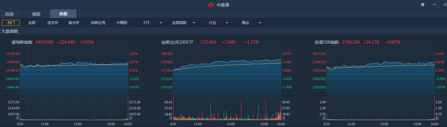 受益于美国强劲经济数据以及贸易战担忧缓解,周四美股普涨,标普500涨0.87%,创2月1日以来收盘新高,道琼斯涨幅0.91%,纳斯达克涨幅1.39%,创收盘纪录新高。