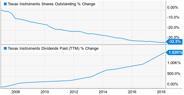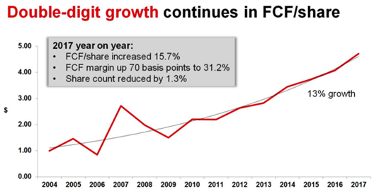 强大的现金获取能力可以让公司丰厚回馈投资者,通过股票回购,提高股息支付,投资者享受了丰厚的收益。公司2017年流通股本下降1.3%,而从2008年以来,公司流通股本已经下降32.5%,而且公司股息支付增长了1.62K%。