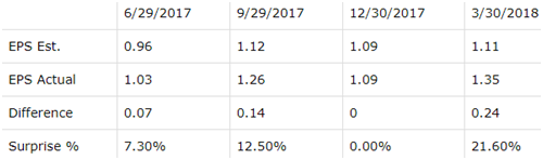 通过下表可以看出,公司近期财报业绩只有2017年12月,符合预期,其他的均为超过预期,最高的超过预期21.60%。