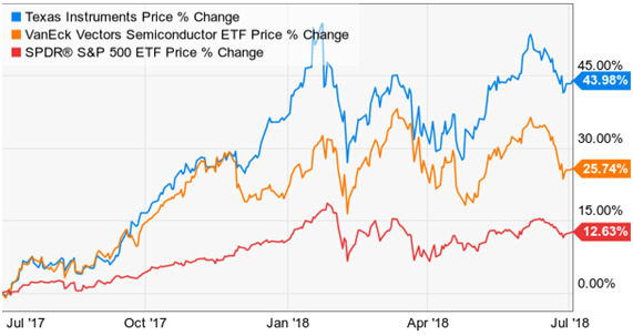 作为美国半导体行业的佼佼者,德州仪器的股价走势,其强度超过行业平均水平,并且远远超过指数上涨幅度。通过下图的对比,可以看出,德州仪器在近一年之中涨幅达到了43.98%,同时期的半导体ETF涨幅为25.74%,标普500ETF涨幅仅为12.63%。