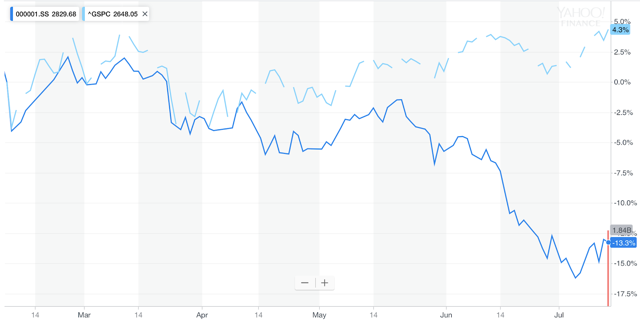 作为中国股市的风向标,上证指数在今年大幅下行,远远比不上标普500指数的表现。如下图所示: