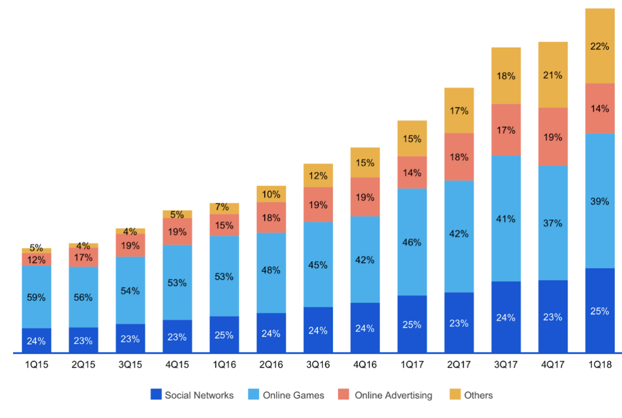 笔者怀疑,很少有读者对腾讯的商业模式有深入的了解。的确,主要的投资热点是微信平台的广告潜力(稍后将对此进行详细介绍),但事实证明,这并不是他们目前最大的业务。我们可以看到,在相当长的一段时间里,他们的电子游戏业务占据主导地位。不过,最近在线游戏占总收入比重不到40%。