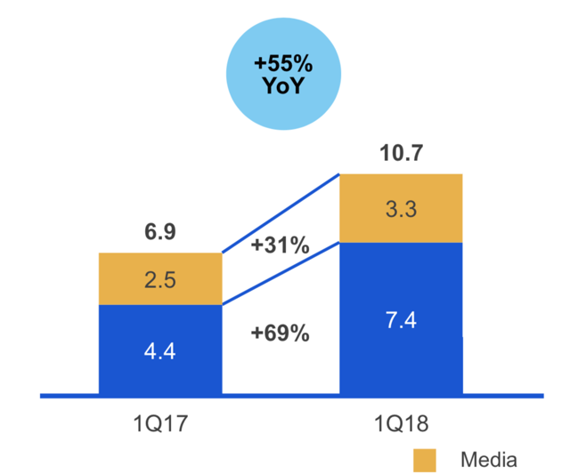 不过,Facebook有一个能够综合所有朋友动态的主页提要(feed)。事实证明,这是极具吸引力的播放广告的区域。然而微信却没有类似的设置,这意味着他们目前尚未充分发挥其盈利潜能。既然他们拥有如此庞大而活跃的用户群体,要想进一步盈利,接下来就只是建设feed的事情了。在2017年,腾讯的广告收入为404亿人民币。今年第一季度的广告收入同比增长55%: