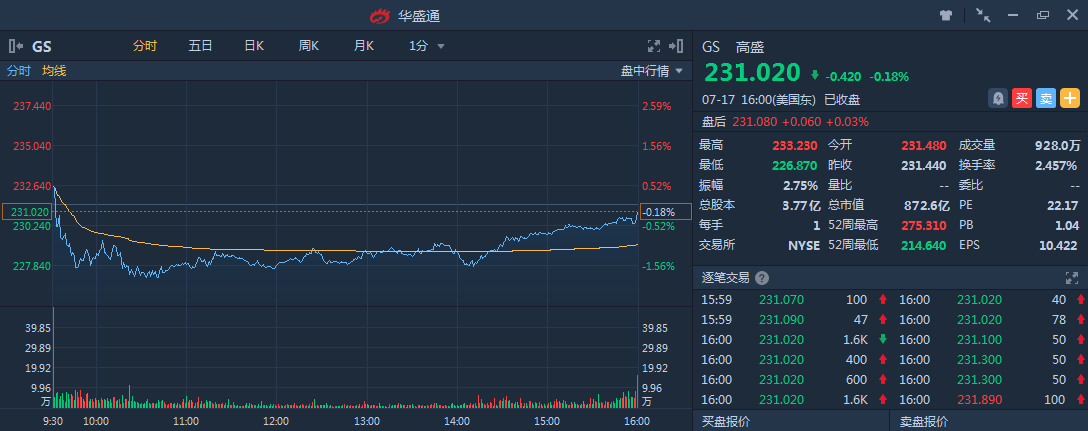美东时间7月17日盘前,高盛集团发布2018年Q2财报:该季度净营收94亿美元,超出预期6.6亿美元,同比增长19.1%;归属于股东的净利润为23.48亿美元,同比增长44%;EPS为5.98美元,比预期高1.32美元。除财报亮眼数据之外,高盛CEO还表示今年上半年表现是近九年最佳,但当日公司股价却意外小幅下跌0.18%,报收231.02美元,盘中跌幅一度达到2%。以下是关于财报的具体分析: