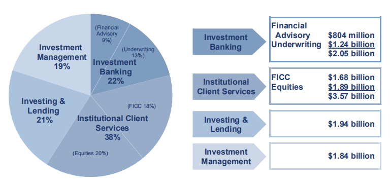 其中投行业务表现惊喜,净营收20.5亿美元,超出市场预期的18.4亿美元,同比增长18%。该业务分为财务咨询和证券包销两个部分,其中证券包销营收12.41亿美元,同比增长高达27%;财务咨询营收8.04亿美元,同比增长7%。增长原因是该季度美国股市IPO需求旺盛并且合并收购案频出,推动投行业务出现明显增长。