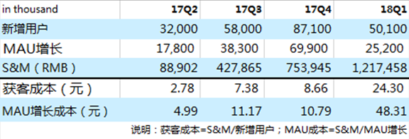 根据招股书数据测算可知,2017年的获客成本在10元上下,18Q1成本略有提升,达到24.3元/人。同样,每个MAU增长成本在18Q1也大幅提升48.3元。