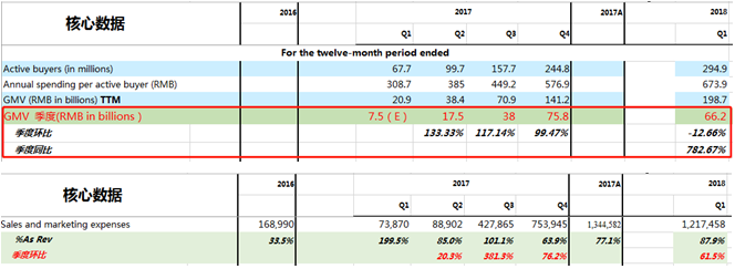从公众号起步,享受小程序红利,再加上拼团、砍价、免费拿一系列活动,特别是拼单天生带量模式下,自然流量在初期快速急速膨胀。如果用S&M和GMV作对比,尽管季度Sell增幅超过GMV增长,但是17Q4。拼多多GMV已经突破758亿,这个杠杆非常划算。