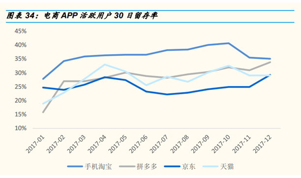 从电商30日留存率上来看,在最近的统计窗口中,拼多多指标不错。除了电商传统的优惠券、促销手段外,拼多多主打社交电商是具备粘性的(薅羊毛上瘾),同时签到领现金、9.9特价、游戏福利,这些手段对于价格敏感群里的杀伤力非常强,留存也较为有效。