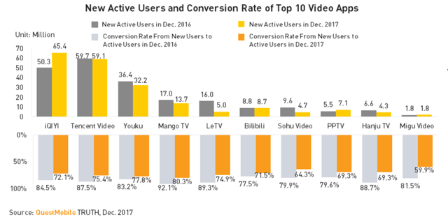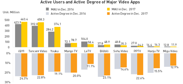 爱奇艺是中国在线视频市场的领导者,公司拥有中国最多的月活跃用户数,用户粘性也是最强的(以月活跃度衡量,结果如下图所示)。