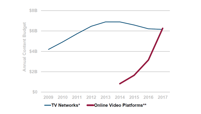 2017年是中国在线视频行业具有里程碑意义的一年,如下图所示,在线视频平台的内容预算首次超过传统网络电视。这是用户观看习惯从传统电视转向在线视频趋势的开始,在线视频平台独家制作的视频内容因此会得到加速。