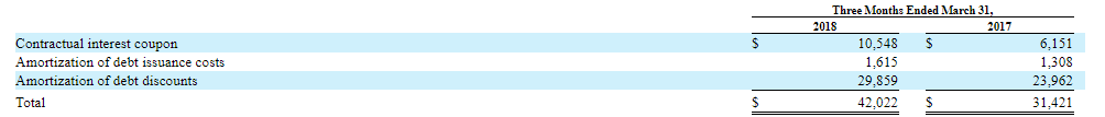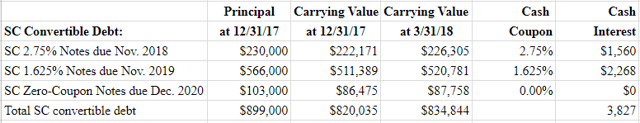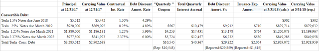 2017年3月31日至2018年3月31日这一年内,发行的三只可转债账面价值增加了约1.25亿美元,从28.04亿美元增至29.29亿美元。如果加权平均利率约为5.5%,这意味着每年的利息支出增加了约700万美元,每季度需要支付的利息费用超过150万美元。
