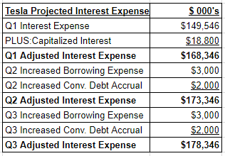 第一季度,特斯拉报告的利息为1.495亿美元,资本化利息1,880万美元,导致利息总额(费用化&资本化)为1.683亿美元。第二季度,预计信贷贷款将产生新增利息费用300万美元,可转换债务将产生新增利息费用200万美元,这意味着第二季度的总利息为1.733亿美元。