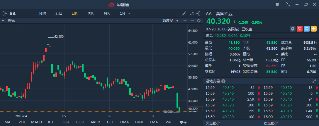 美东时间7月18日盘后,美国铝业发布2018财年Q2财报,虽然该季度利润大涨,但受美国钢铝关税政策影响,公司下调今年预期导致股价大跌,19日单日跌幅高达13.34%,20日继续下跌2.98%。
