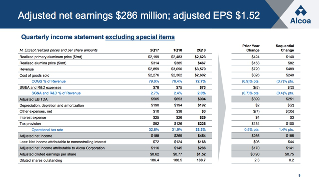 在行业大环境利好下,公司Q2各分部调整后EBITDA除铝矿石分部外均出现大幅上涨,其中氧化铝分部调整后EBITDA为6.38亿美元,同比增长63%;铝分部2.31亿美元,同比增长51%;铝矿石分部1亿美元,下跌9%。具体数据见下图: