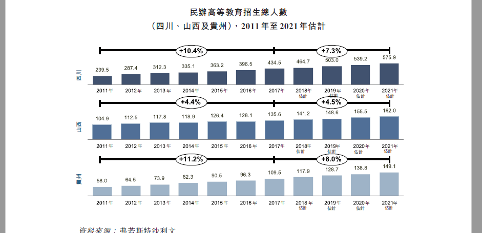 招股书中,希望教育披露了自身院校所在省份的生源增长预测,四川和贵州未来五年复合增长为7.3%和8%,而山西增加仅为4.5%。