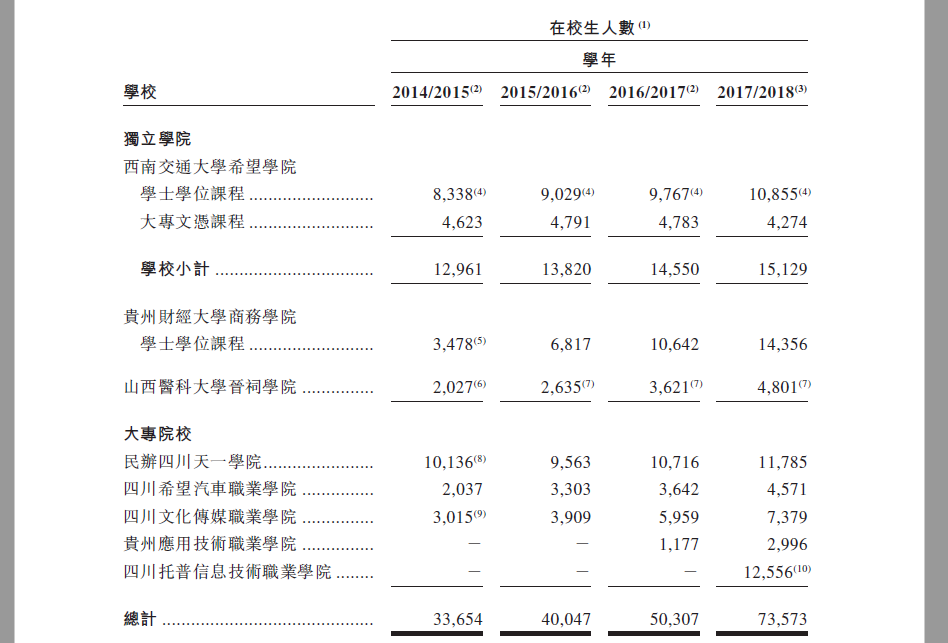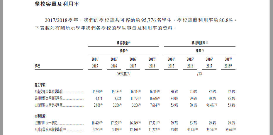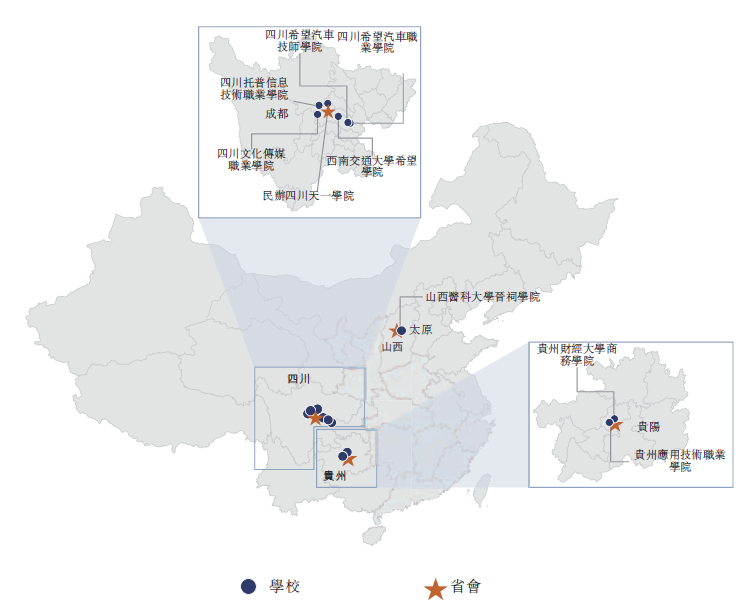截至2018Q1,希望教育在四川、贵州和山西运营八所提供普通高等教育学校。