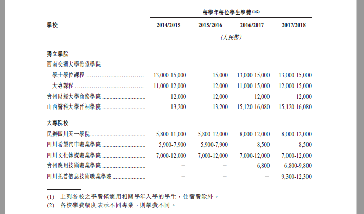 近三年,公司旗下学校均有提高学费记录,在记录期内包括: