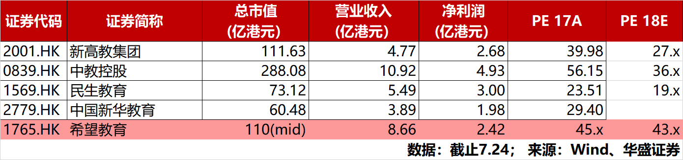 综上,采用中性测算取值,预计希望教育2018年净利2.58亿元,目前港股教育行业18年PE为30倍,考虑到负债较多,IPO后可用于并购的资金有限,给予25倍的PE,对应市值为人民币64.5亿。