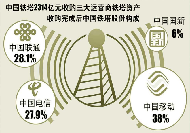 中国铁塔股份有限公司(简称中国铁塔)于2014年7月5日由中国移动、中国电信、中国联通三大电信运营商联合成立,目前是全球规模最大的通信铁塔基础设施服务提供商。2015年12月31日引进中国国新入股,目前中国移动、中国联通、中国电信和中国国新持股占比分别是38.0%、28.1%、27.9%、6.0%。