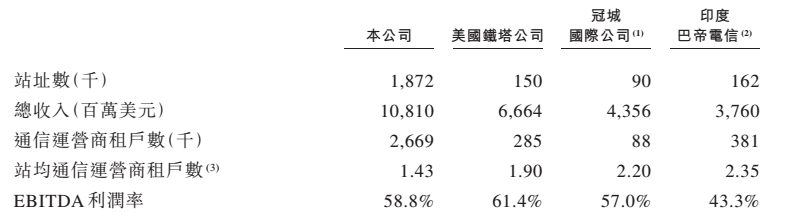 中国铁塔与全球主要上市通信铁塔基础设施服务提供商相比,无论在站址数、总收入、租户数等上都表现出一定的优势。