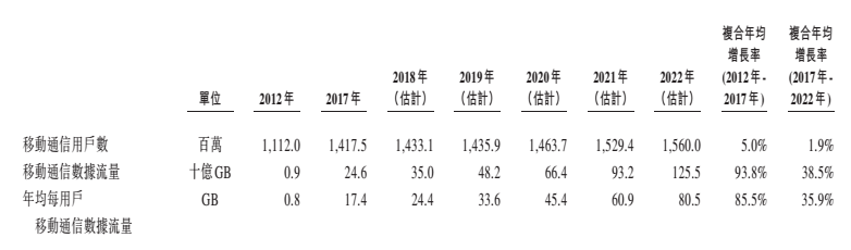 移动通信用户数量及需求稳定增加。移动应用,包括电子商务、网络游戏及视频流服务等需求在中国迅猛增长,使中国市场的移动通信数据流量大幅增长,未来年均每用户移动通信数据流量将超过80GB,复合年均增长率为35.9%。
