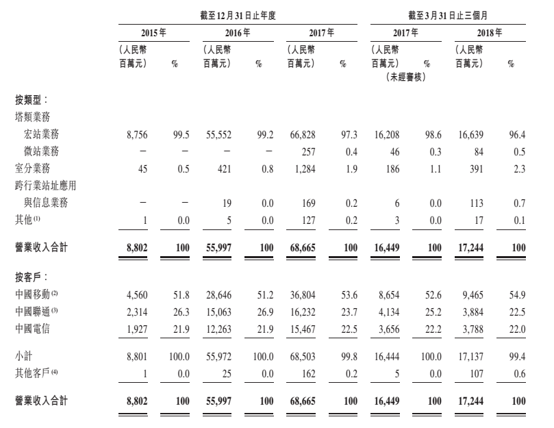 2018年第一季度营业收入为172.44亿,2017年第一季度营业收入164.49亿,2018年第一季度同比增长4.8%,增长主要是由于租户数的增加,由2017年第一季度的2,483,918户增加至2018年第一季度的2,733,500户。此外跨行业站址应用与信息业务的收入有大幅增长,原因是2018年年初更加积极地承接更多跨行业站址应用与信息业务。