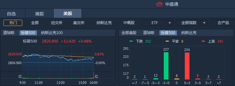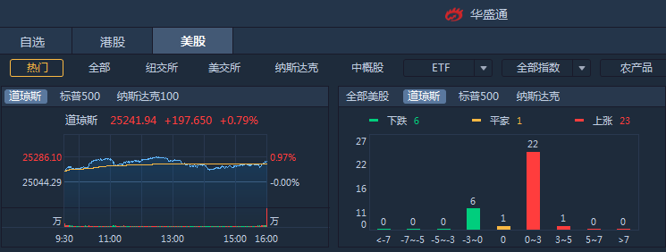 美股周二整体走强,道指最高上涨近1%,谷歌财报亮丽带动纳斯达克早盘大涨刷新历史新高,不过尾盘大幅回落,标普500收涨0.48%,道琼斯收涨0.79%,纳斯达克收跌0.01%。