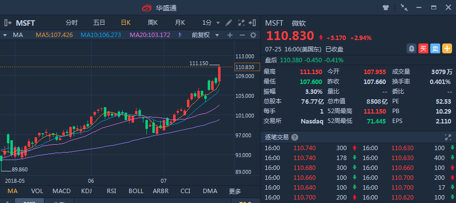 美东时间7月25日,微软(MSFT)股价上涨2.94%,收盘价为110.830美元。最新财报显示,微软各项业务均实现增长,同时其资产负债表和股票回购的情况也同样令人振奋。