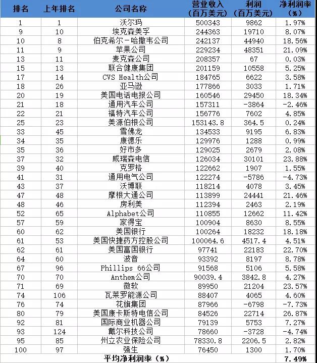 我们再将范围延伸至排名前100位,里面共有20家中国企业,基本是国企当道,仅有3家民企入围。整体平均净利润率为6.65%,如果将暴利的银行剔除,平均净利润率仅为3.30%。看来,银行大佬们还是拔高盈利主力军。