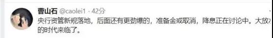 于是,救市呼声此起彼伏,各类放水传言满天飞。尤其是上周公布的资管新规和理财新政比预期宽松,财经网红曹山石爆料“央行准备金或将取消,降息正在讨论,大放水时代来临”,底下的银行蠢蠢欲动。