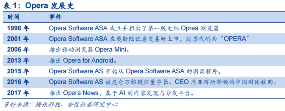 在2G时代,公司凭借流量压缩技术获得功能机用户青睐,但在随后的3/4G时代则因Google Chrome和Apple Safari等浏览器崛起而逐渐陷入困境。2016年7月,昆仑万维与奇虎360、金砖丝路等公司组成了买方团,共同购买Opera品牌以及旗下移动浏览器和桌面浏览器等核心消费者业务。最终交易价格为 5.75 亿美元,于当年11月完成交割。