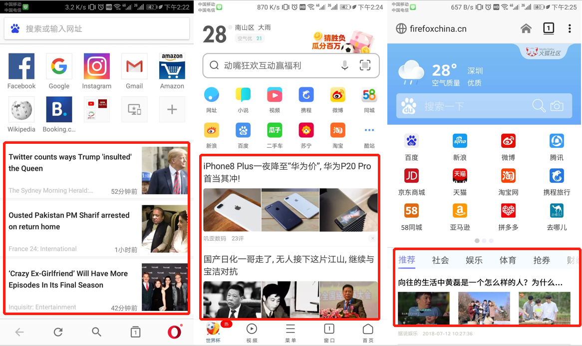为了获取更多用户的注意力及相应的广告收入,浏览器向内容领域的拓展,下图左中右分别为Opera、UC、Firefox,从内容区域的占比可以看出,Opera向内容转型的力度最大。