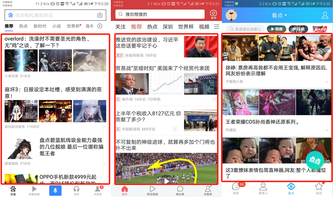 这种拓展使得公司的竞争对手实际上包括所有泛内容的互联网公司(社交、搜索、新闻等等)。下图左中右分别为手机百度、今日头条、QQ看点,可见浏览器、搜索、新闻、社交(部分功能点)APP在产品形态上越来越趋同,这意味着内容领域越来越激烈的竞争。