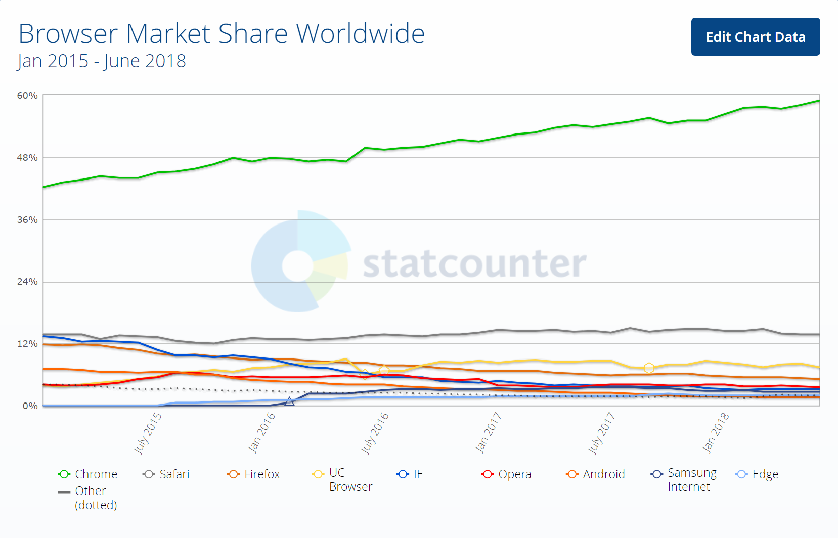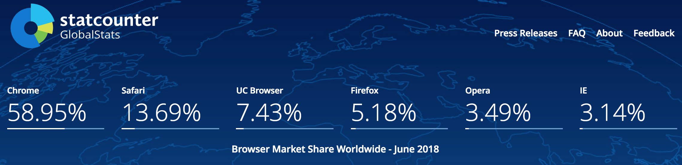 根据StatCounter公布2018年6月各浏览器的市场份额,Chrome 6月以 58.95% 的比例稳居全球全平台第一,Safari 和 UC 浏览器分别以 13.69% 和 7.43% 的成绩拿下第二名和第三名。Firefox 占比 5.18%,相比5月有小幅下滑。Opera以3.5%占比居第五。