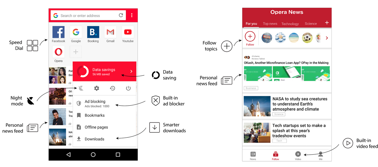 据Opeepl在2017年为Opera进行的一项调查显示,公司品牌在东南亚和非洲得到了广泛认可,在关键市场的智能手机用户中有超过50%的品牌认知度。2018年1月,公司在非洲市场推出了独立的Opera News。在发布后的4周内,其下载量超过100万次,是尼日利亚、坦桑尼亚、肯尼亚和加纳五国Google Play Store下载量最多的新闻资讯APP。