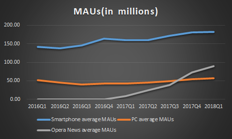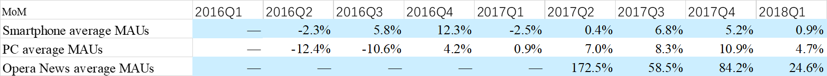 2018年Q1,平均有9020万个MAUs访问Opera新闻,比2017年同期的910万台平均MAUs增加了。此外,在2018年3月31日终了的三个月里,启用AIRE浏览器的平均用户时间达到了每天大约32分钟,比2017年同期的23分钟增加了40.4%。但2018Q1 Opera News 平均MAUs的环比增速为24.6%,下滑较快需要警惕。