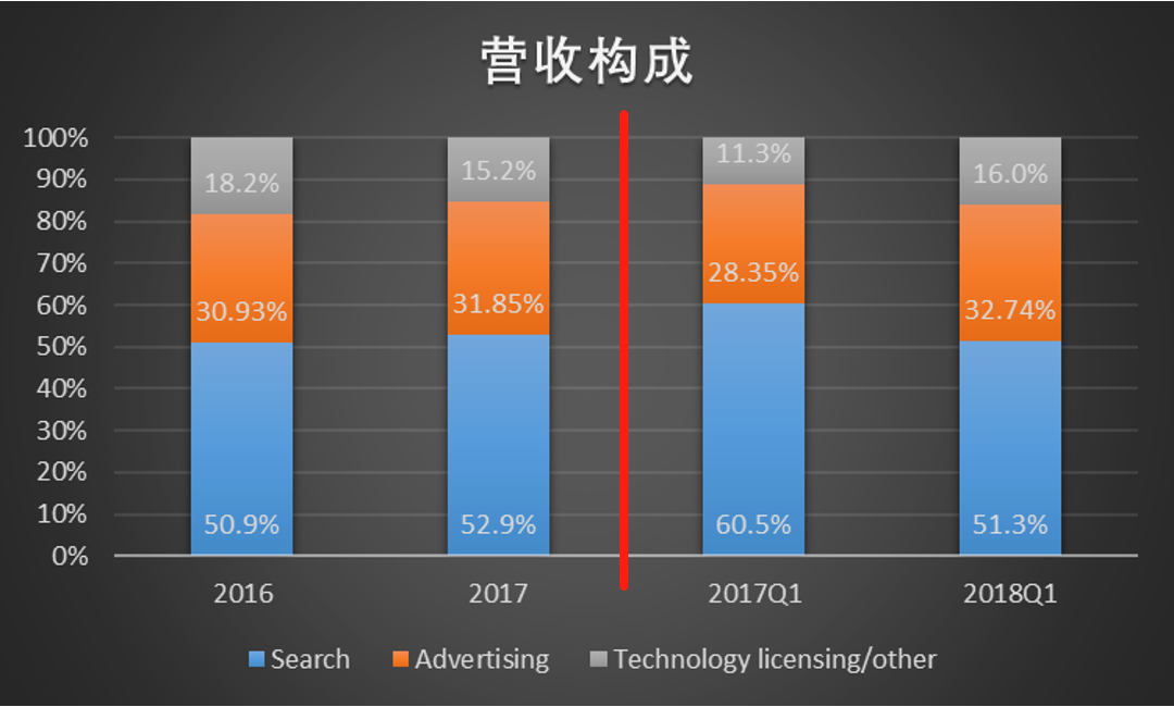 公司营收按业务可分为搜索、广告、技术许可及其他三大类: